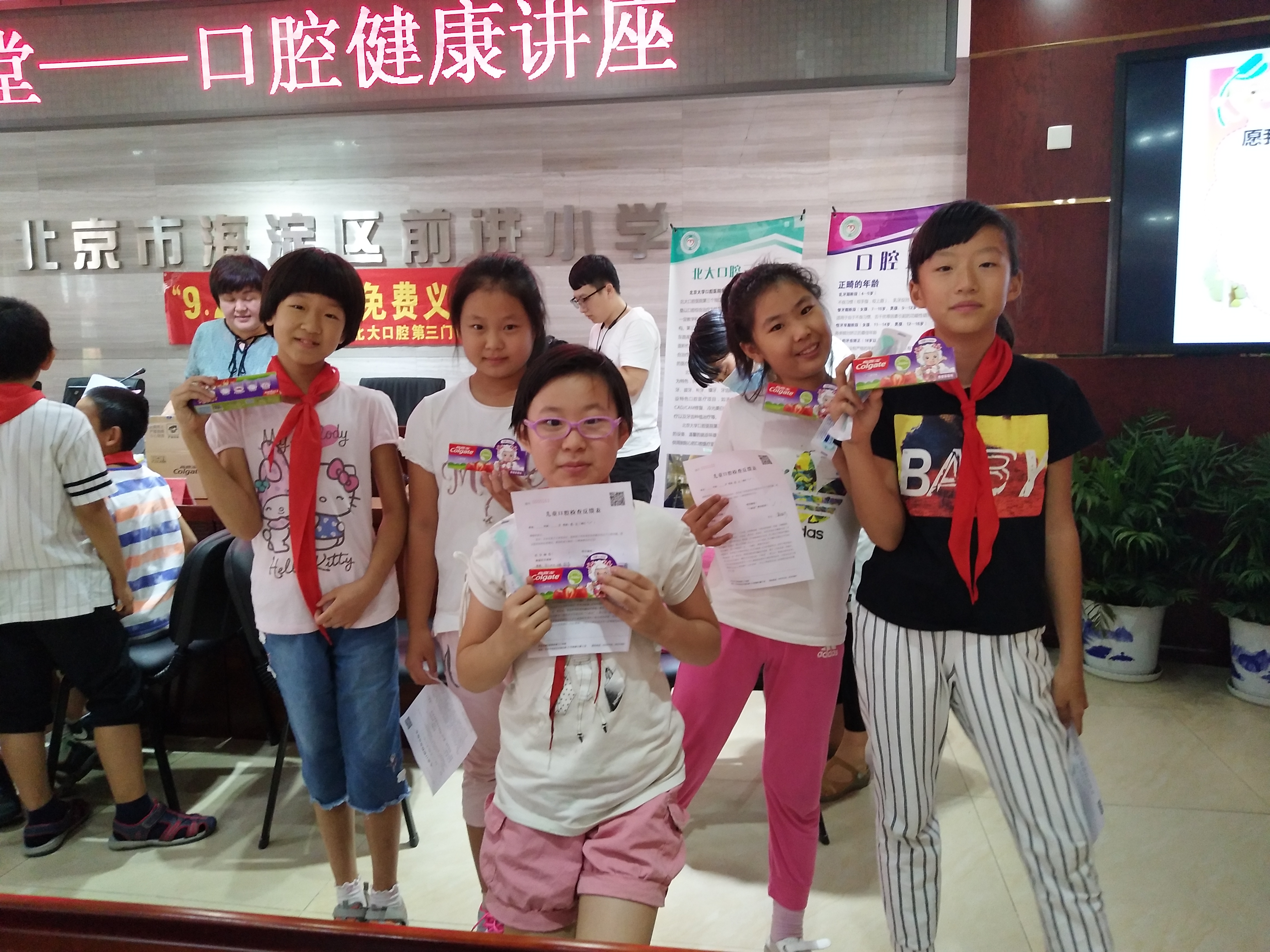 “口腔健康,全身健康”是2017年全国爱牙日的主题。在第29个爱牙日即将来临之际,北京大学口腔医院第三门诊部精心筹划组织了爱牙日公益活动,旨在强化大众对口腔健康的关注。9月19日下午,三门诊在前进小学为五、六年级的200余名小朋友进行了口腔知识科普宣教和免费口腔检查,活动现场气氛热烈,收到了良好的效果。门诊部医、护及行政共计8名工作人员参加了本次活动。