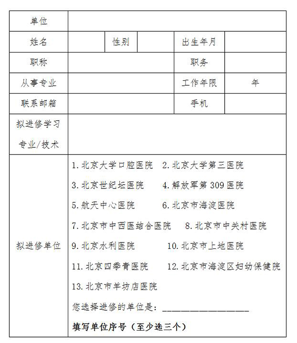 意向人员需填写《海淀区口腔专科医联体社区口腔专业骨干医师进修报名表》(附件)。