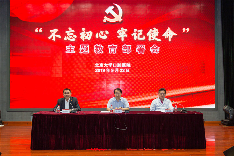 会上,党委书记周永胜作工作部署。他指出,开展“不忘初心、牢记使命”主题教育是用习近平新时代中国特色社会主义思想武装全党的迫切需要,是推进新时代党的建设的迫切需要,是保持党同人民群众血肉联系的迫切需要,是实现党的十九大确定的目标任务的迫切需要,对于统筹推进“五位一体”总体布局、协 调推进“四个全面”战略布局,实现“两个一百年”奋斗目标、实现中华民族伟大复兴的中国梦,具有十分重大的意义。医院要提高政治站位,突出政治建设,贯彻落实习近平新时代中国特色社会主义思想和习近平总书记关于健康中国战略和教育工作的重要讲话和指示精神,始终坚持正确办医、办学方向,要全面落实立德树人根本任务,牢记为人民口腔健康做奉献,为党和国家培养口腔医学人才的初心使命。
