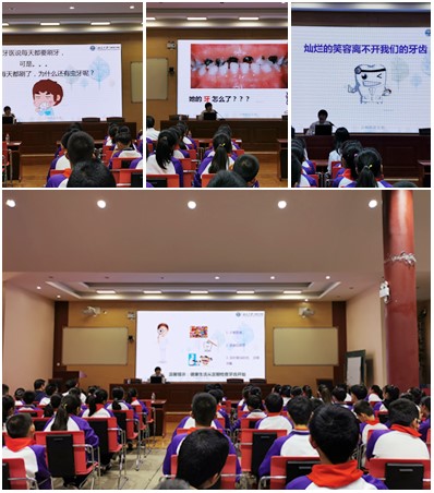 2019年11月11日,北京大学口腔医院正畸科党支部梁炜书记率领7名支部成员来到北京市石景山区鲁谷路永乐小区,在北京市同文中学,举办了一场来自北大口腔的爱牙护齿口腔公益讲座。讲座围绕儿童口腔健康知识及龋病防治展开,经过同文中学夏伟平校长和初一年级教学主任张桥老师等的精心组织,140多名学生到场参加学习讲座。