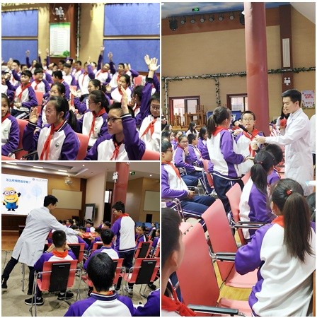 王雪东副主任医师为同学们进行了生动的“如何正确刷牙”的现场秀,四位小志愿者亲身体验,现场气氛非常活跃。其他孩子们积极参与有奖问答环节,并得到了牙刷、牙膏等奖品