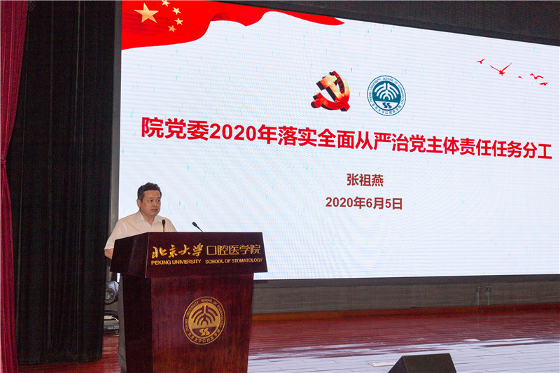 随后,党委副书记张祖燕宣读了《北京大学口腔医(学)院党委2020年落实全面从严治党主体责任任务分工》。他对医(学)院党委2020年全面从严治党的总要求、任务要求、主体责任领导和责任部门等方面进行了介绍,强调要以党的政治建设为统领,全面加强纪律建设,不断推进医院治理体系和治理能力现代化。