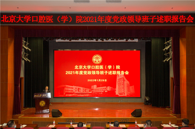 年终岁尾,辞旧迎新。北京大学口腔医(学)院2021年度党政领导班子述职报告会于2022年1月29日下午在教学楼报告厅举行。全体党政领导班子、科主任、党支部书记、教代会代表参会。大会由党委书记周永胜主持。