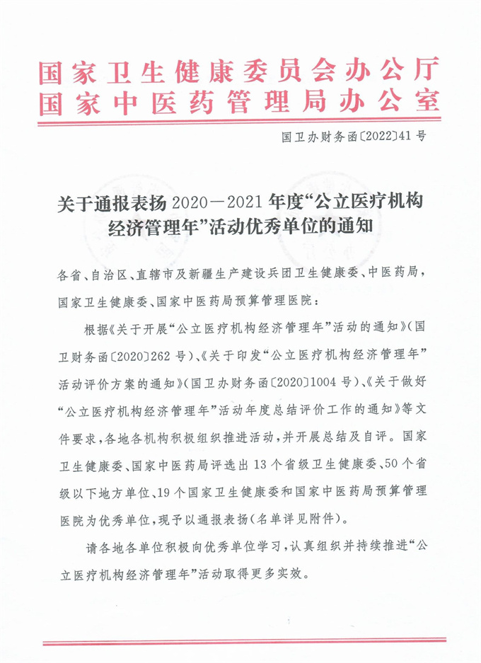 近日,国家卫生健康委员会办公厅、国家中医药管理局办公室联合印发了《关于通报表扬2020-2021年度“公立医疗机构经济管理年”活动优秀单位的通知》(国卫办财务函〔2022〕41号),通报表扬了13个省级卫生健康委、19个国家卫健委和国家中医药局预算管理医院,50个省级以下地方单位,其中北京大学口腔医院是获通报表扬的国家卫健委属唯一口腔专科医院。