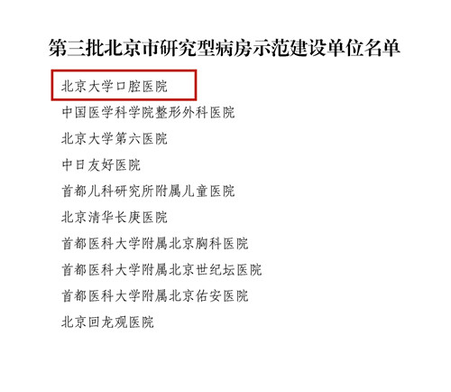 近日,北京市卫生健康委发布通知确定北京大学口腔医院为第三批北京市研究型病房示范建设单位,是目前为止全市唯一一家获批研究型病房示范建设单位的口腔专科医院。