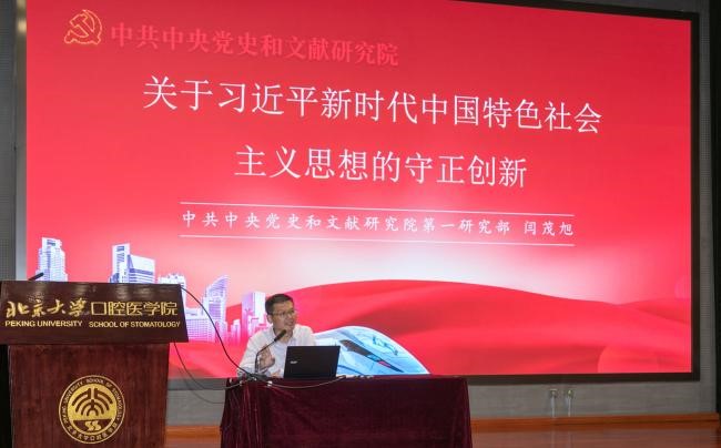 在主题教育如火如荼开展之时,北京大学口腔医院再掀学习热潮。作为北京大学口腔医院学习贯彻习近平新时代中国特色社会主义思想主题教育内容之一,5月18日下午,医院邀请中共中央党史和文献研究院第一研究部编研八处处长、一级调研员闫茂旭为大家带来《关于习近平新时代中国特色社会主义思想的守正创新》专题报告。报告会由党院办主任宋代莹主持。